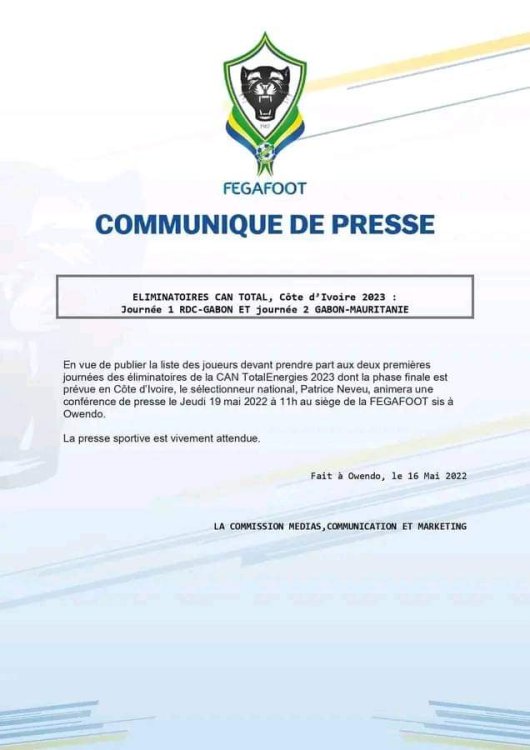 Le sélectionneur des Panthères du Gabon, Patrice Neveu, animera une conférence de presse ce jeudi dans le cadre des éliminatoires de la CAN 2023 pour décliner les 23 joueurs retenus pour les deux premières journées.