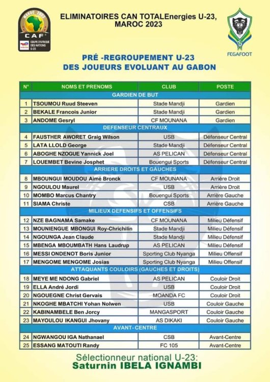 C’est par le biais d’un communique de presse du 28 septembre 2022 que la Fédération gabonaise de football (Fegafoot) a décliné la liste de 25 joueurs évoluant au Gabon présélectionnés pour faire partie de l’équipe nationale U23 du nouveau coach Saturnin Ibela Ignambi.